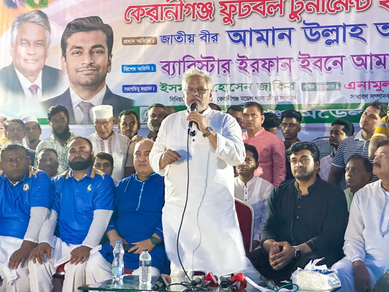 শুক্রবার (২৬ সেপ্টেম্বর) কেরানীগঞ্জ মডেল থানা ক্রীড়া সংগঠন এর আয়োজনে ১৫টি মাঠকে ভেন্যু করে অনুষ্ঠিত কেরানীগঞ্জ ফুটবল টুর্নামেন্ট ২০২৪-২৫ এর ফাইনাল খেলা ও পুরস্কার বিতরণী অনুষ্ঠানে তিনি এ কথা বলেন। প্রধান অতিথির বক্তব্যে আমান উল্লাহ আমান বলেন, খেলাধুলাকে দলীয়করণ ও রাজনীতিকরণের বাইরে এনে নতুনভাবে এর উন্নয়নে কাজ করতে হবে। দেশের স্বাস্থ্য ও আত্মরক্ষায় ফুটবল খেলা প্রতিযোগিতার মতো অন্যান্য খেলাধুলা যেমন : ক্রিকেট ও হকির সার্বিক উন্নয়নে বিএনপি কাজ করবে। ভবিষ্যতে কেরানীগঞ্জ উপজেলায় ইউনিয়ন পর্যায়েও পর্যাপ্ত খেলার মাঠ, ইনডোর ও আউটডোর গেমসের ব্যবস্থা করার পরিকল্পনা রয়েছে।